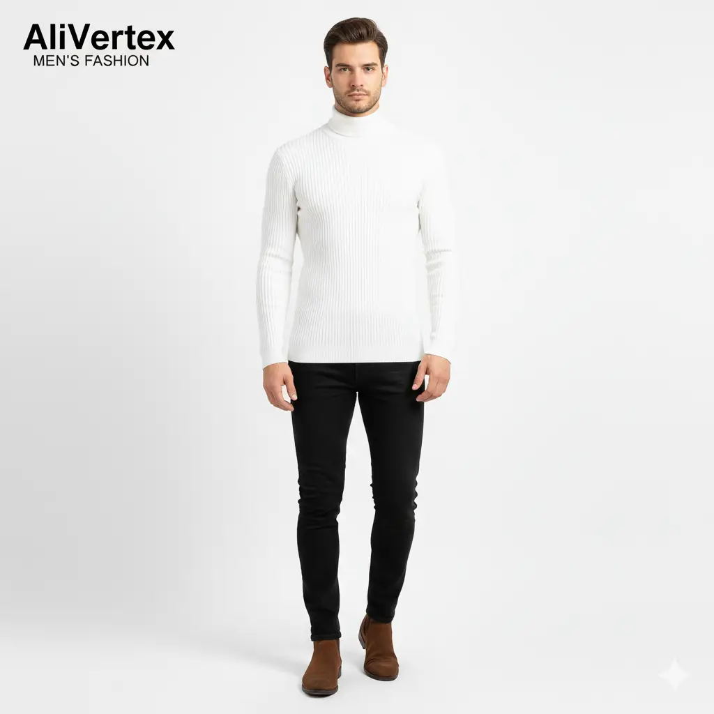 Step up your winter style with the Ali Vertex Black Ribbed Turtleneck, designed for men who prefer both comfort and sophistication.