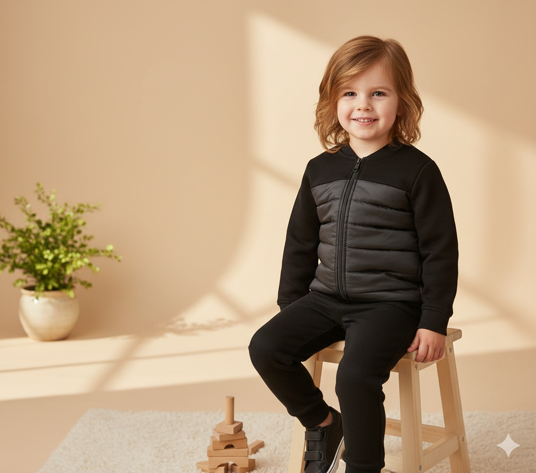 Keep your little one snug and stylish with our Cozy Quilted Kids Jacket. Designed with a soft, textured fabric and insulated quilted front panel, this jacket provides the perfect balance of warmth and comfort. The full zip closure makes it easy to wear, while ribbed cuffs and hem ensure a secure fit. Ideal for indoor or outdoor wear during cooler days, this jacket blends functionality with a modern, minimal look that kids love.