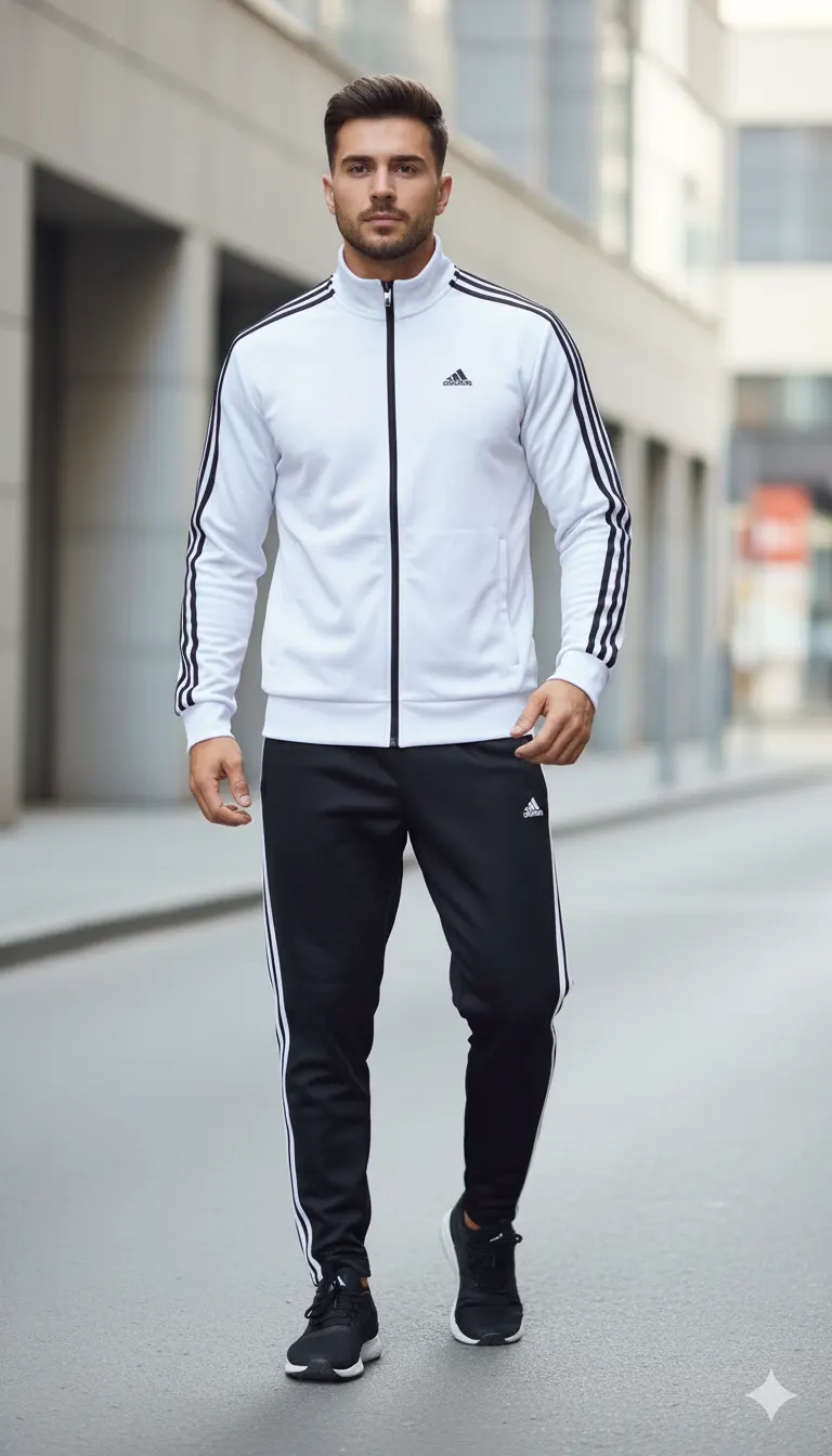 The beige full-zip jacket features a stand-up collar, smooth zipper, and signature double black stripes for a classic athletic look. Paired with black track pants featuring dual white stripes and an elastic waistband, this set delivers the perfect balance of comfort and performance.