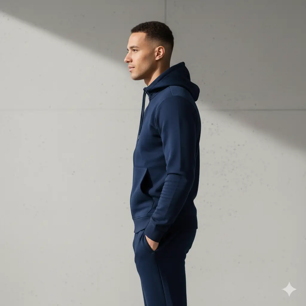 Modern navy tracksuit with zip-up hoodie and joggers. Soft, flexible, and stylish—perfect for daily wear or workouts.
